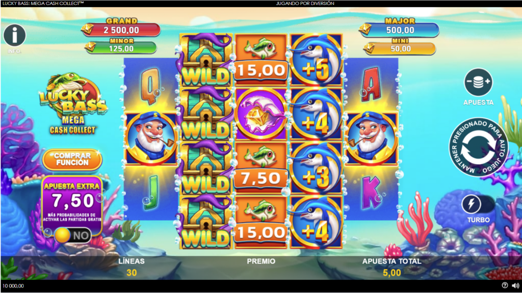 Lucky Bass Mega Cash Collect es otro de los juegos de tragamonedas que te invitan a pescar y divertirte entre olas, gráficos coloridos y el sonido relajante del océano.