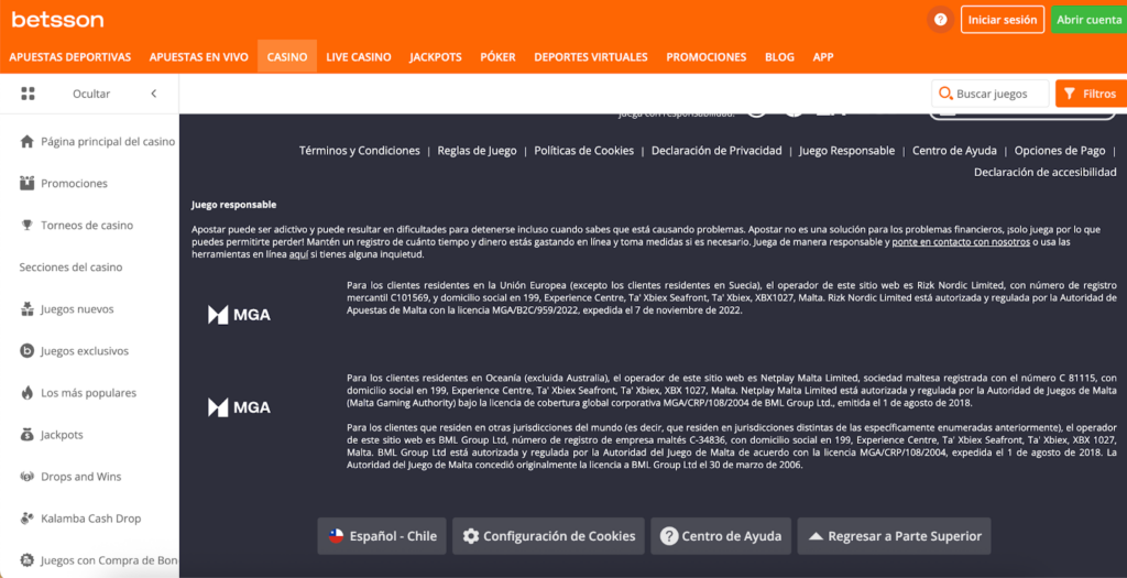Los casinos online confiables tienen, en su pie de página, los sellos de las licencias bajo las cuales operan, como en esta captura de Betsson Chile: